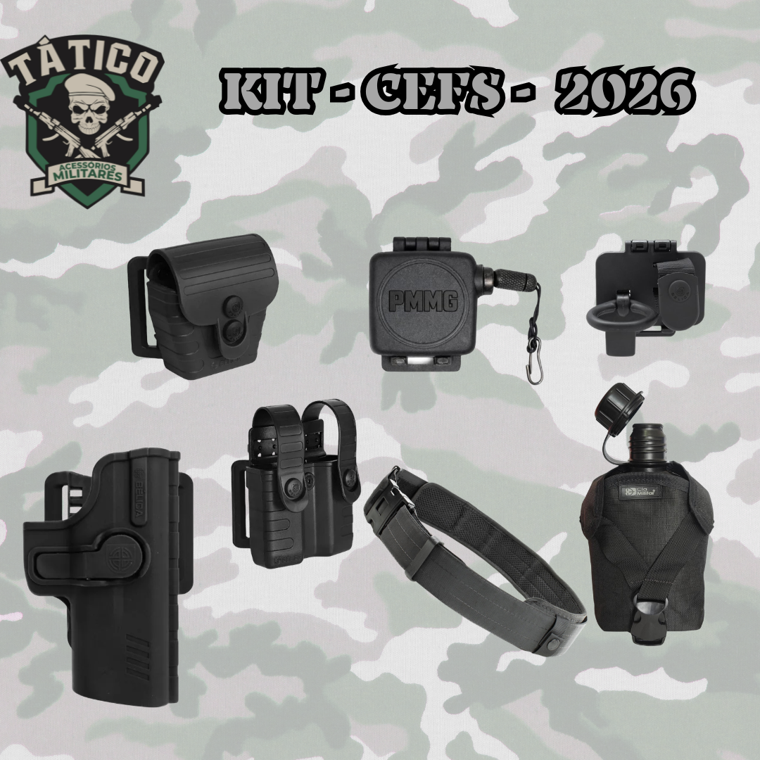 Kit Completo para o CEFS Cinto guarnição Com acessórios Bélica é construído polímero de alta resistência, passador anatômico, fita com acabamento emborrachado aderente e ficho de 3 pontos.