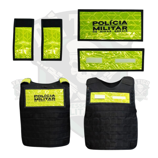 KIT com 4 faixas visibilidade Polícia de Minas Gerais (PMMG) sendo duas para os ombros, uma para costas bordado, e uma para frente com velcro para colocar tarjetas. Credenciado junto a DAL conforme regulamento. (Esse modelo ainda é válido por 3 anos).